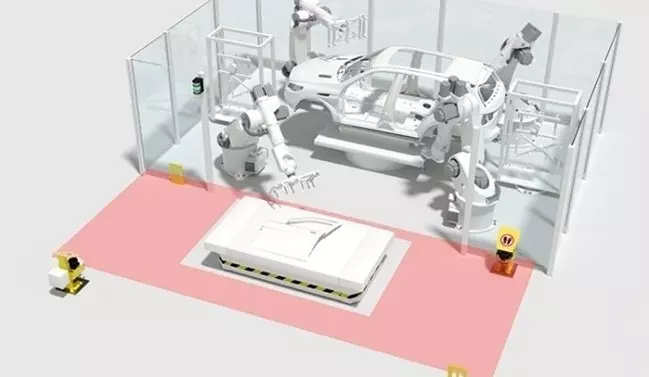 Aby zainicjować wjazd lub przejazd pojazdu AGV zainstalowany w nim system sterowania transportem materiałów musi z wyprzedzeniem zgłosić swoją trasę w systemie bezpieczeństwa. W zależności od oceny ryzyka dla danej aplikacji, w przypadku naruszenia pola ochronnego, oprócz zatrzymania komórki robota może być również konieczne zatrzymanie pojazdu AGV. Rozwiązanie to opiera się na założeniu stworzenia bezpiecznej komunikacji między komórką a pojazdem AGV.