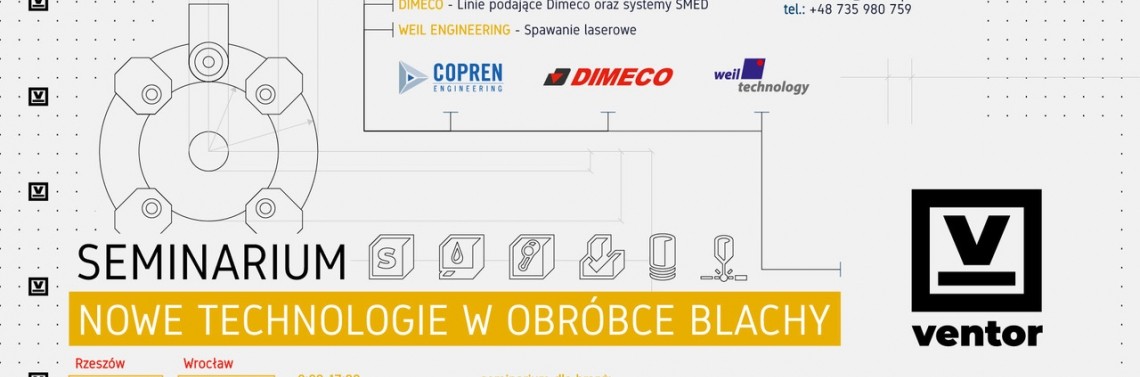 Firma VENTOR - dostawca innowacyjnych rozwiązań do obróbki plastycznej blach wspólnie ze swoimi partnerami: DIMECO, WEIL TECHNOLOGY i COPREN serdecznie zapraszają na pierwszą edycję specjalistycznych seminariów branżowych, p