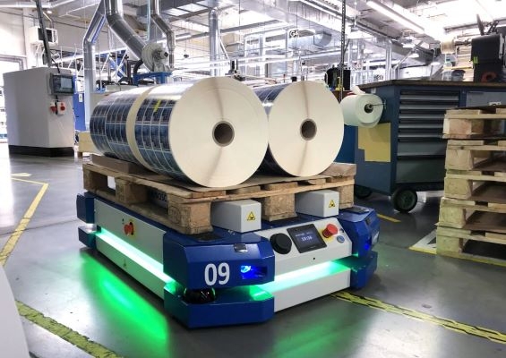 AGV w trakcie pracy – pojazd sterowany automatycznie ładuje materiał do stacji dokowania.